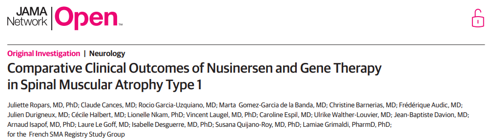 Ropars J, Cances C, Garcia-Uzquiano R, et al. Comparative Clinical Outcomes of Nusinersen and Gene Therapy in Spinal Muscular Atrophy Type 1. JAMA Network Open. 2025; Published online Oct 8, 2025. doi:10.1001/jamanetworkopen.2025.36348