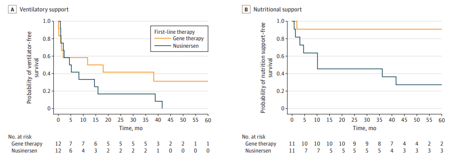 随访期间,治疗首年内,基因治疗组1人(8%)与Nusinersen组2人(17%)因呼吸衰竭死亡,均为SMA1a亚型,基线运动功能低,无药物相关严重不良。2年后,基因治疗组仅1人(9%)需营养支持,Nusinersen组则有5人(50%)需营养支持;基因治疗组5人(45%)需夜间通气,Nusinersen组为8人(80%)。
