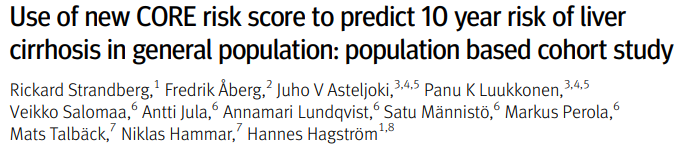 Strandberg R, Åberg F, Asteljoki JV, et al. Use of new CORE risk score to predict 10 year risk of liver cirrhosis in general population: population based cohort study. BMJ. 2025;390:e083182. Published 2025 Sep 29. doi:10.1136/bmj-2024-083182