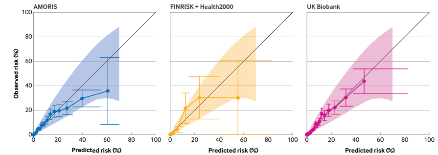 图:CORE模型在训练数据及两个验证数据集中的校准图。预测风险被分组,每组的10年累积发病率被估算,代表该组的平均实际观察风险