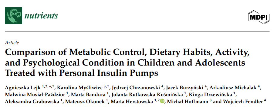 Lejk, A.; Myśliwiec, K.; Chrzanowski, J.; Burzyński, J.; Michalak, A.; Musiał-Paździor, M.; Bandura, M.; Rutkowska-Kośmińska, J.; Drzewińska, K.; Grabowska, A.; et al. Comparison of Metabolic Control, Dietary Habits, Activity, and Psychological Condition in Children and Adolescents Treated with Personal Insulin Pumps. Nutrients 2025, 17, 3304. https://doi.org/10.3390/nu17203304