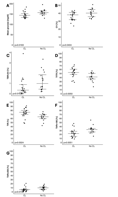 结果显示,两组患者在年龄、性别比例、体型指标及疾病持续时间方面无显著差异。CGM数据显示,使用AHCL系统的患者平均血糖更低(144.02 mg/dL vs. 157.06 mg/dL,p=0.0193),血糖变异系数(CV)更小(38.03% vs. 40.24%,p=0.0404),目标血糖范围内时间(TIR)更长(52.52% vs. 41.57%,p=0.0050),高血糖时间(≥180 mg/dL)和严重高血糖时间(≥250 mg/dL)均显著较少。