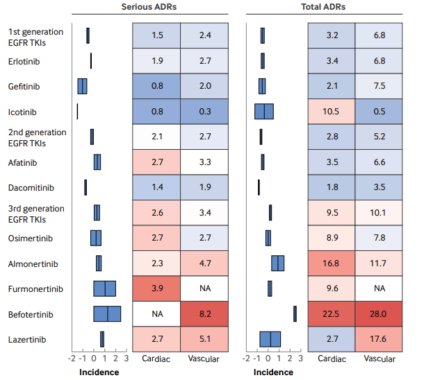 图:第一至第三代EGFR-TKIs相关的心血管药物不良反应。深红色表示合并发病率较高,深蓝色表示合并发病率较低