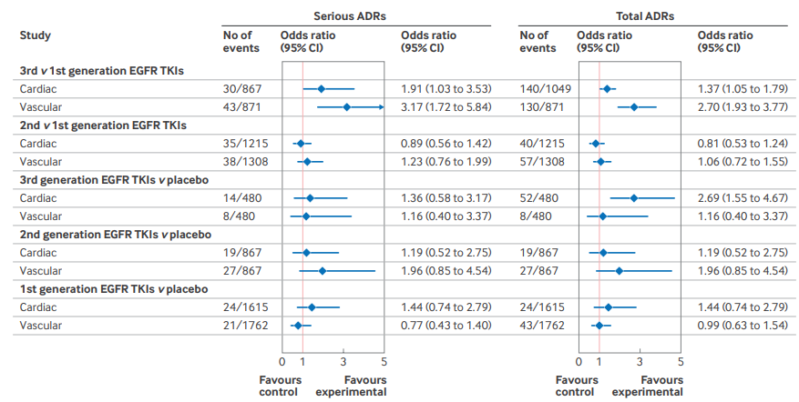 本系统评价及网络荟萃分析纳入89项随机对照试验,涉及29,813名EGFR突变NSCLC患者,平均随访2.18年。与安慰剂相比,第一代EGFR-TKIs(OR 1.51)和第三代EGFR-TKIs(OR 2.18)均显著增加心脏不良事件风险,其中奥希替尼(Osimertinib)和拉泽替尼(Lazertinib)表现尤为显著。联合抗血管生成疗法(如与厄洛替尼或吉非替尼联合)显著增加血管不良事件,而奥希替尼与抗血管生成药物联合则增加心血管不良事件风险。