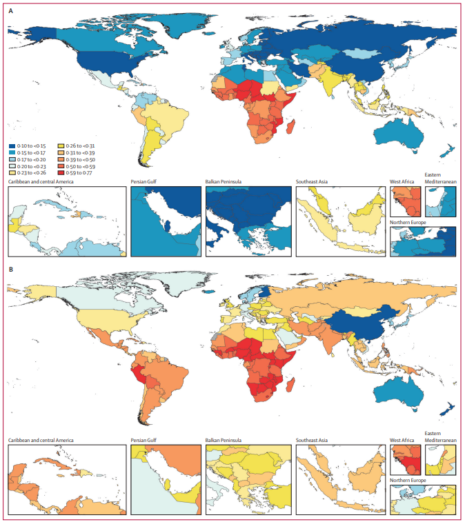 图:2019年(A)和2021年(B)按国家划分的所有年龄中,所有死因由脓毒症导致的比例