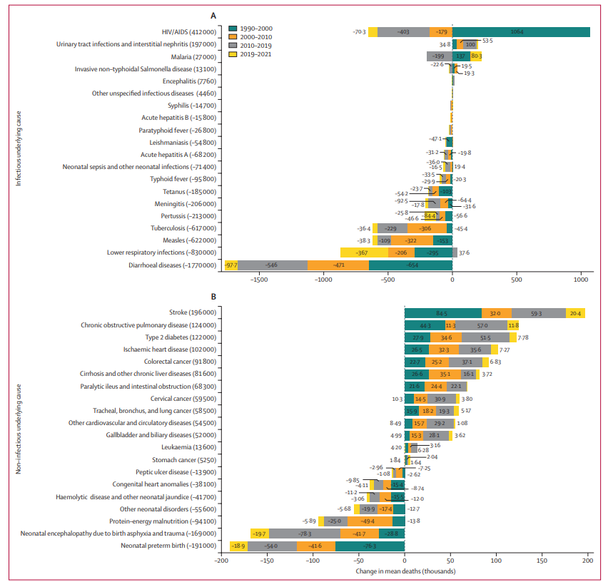 图:1990–2021年期间,与前20个主要感染性(A)和非感染性(B)基础病因共同发生的全球脓毒症相关死亡人数的变化
