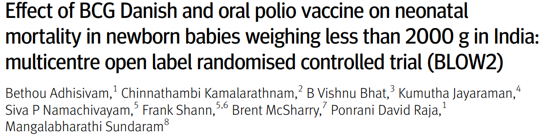 Adhisivam B, Kamalarathnam C, Bhat BV, et al. Effect of BCG Danish and oral polio vaccine on neonatal mortality in newborn babies weighing less than 2000 g in India: multicentre open label randomised controlled trial (BLOW2). BMJ. 2025;390:e084745. Published 2025 Sep 22. doi:10.1136/bmj-2025-084745