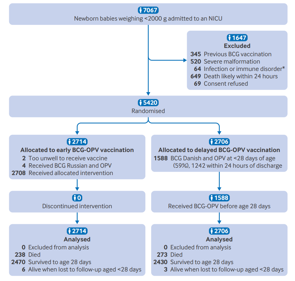 研究人员在印度东南部三家大医院的NICU开展,纳入入院体重低于2000克的新生儿。共评估7067名入选者,排除符合标准者1647名后,随机分配5420名新生儿,分为早期接种组(2714名,入院48小时内给予0.1 mL丹麦株BCG皮内注射及两滴OPV)和对照组(2706名,延迟至出院时或之后接种)。随机分层依据NICU、性别及体重分类(<1000g、1000-1499g、1500-1999g)。主要观察指标为28天内新生儿全因死亡率,次要指标为感染相关死亡率。采用Cox比例风险模型调整年龄、体重、性别、胎龄等混杂因素进行意向治疗分析。