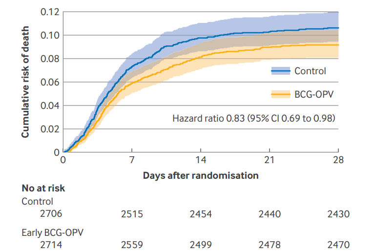 2019年,全球5岁以下儿童死亡中约97.9%发生在非经济合作与发展组织(OECD)成员国的低中收入国家。尽管5岁以下儿童死亡率整体下降,28天内的新生儿死亡率降低有限,现占5岁以下死亡的47%。降低新生儿死亡率尤为迫切。卡介苗(BCG)除预防结核外,可能通过激发“训练性”先天免疫等非特异性效果,降低其他感染导致的死亡风险。不同BCG株间的免疫效应存在差异,丹麦株BCG被认为在非特异性保护上效果较好。此前几项在几内亚比绍及印度的试验结果不一,尤其印度使用的俄罗斯株BCG未见显著效果。本研究针对印度体重低于2000克新生儿,评估丹麦株BCG联合OPV对新生儿死亡率的影响,填补该领域研究空白。