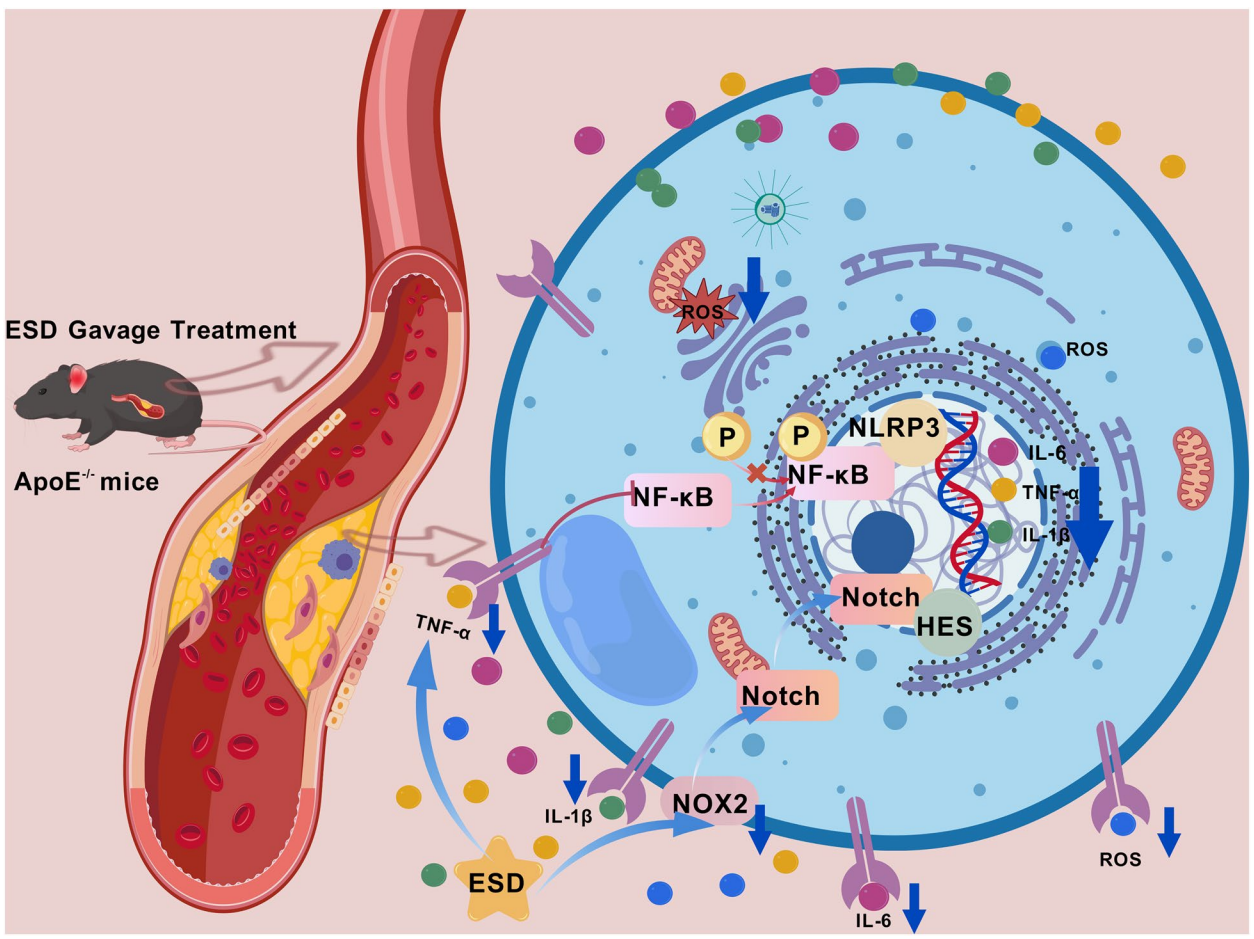 本研究旨在揭示双参丹调控巨噬细胞的分子机制及其治疗动脉粥样硬化的作用。通过超高效液相色谱-质谱联用技术(UPLC-Q-Exactive-MS/MS)分析双参丹的化学成分;利用ApoE基因缺失小鼠建立动脉粥样硬化模型,评估不同剂量ESD对血脂、炎症因子及斑块形成的影响;采用网络药理学结合分子动力学模拟筛选有效成分及其靶点;通过Western blot、免疫组化、细胞实验等技术验证ESD及其活性成分对NOTCH1/NF-κB/NLRP3信号通路及M1型巨噬细胞极化的影响。