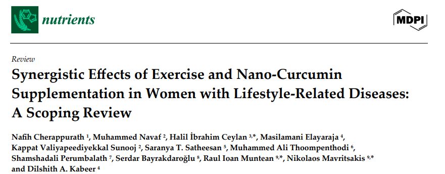 Cherappurath, N.; Navaf, M.; Ceylan, H.İ.; Elayaraja, M.; Sunooj, K.V.; Satheesan, S.T.; Thoompenthodi, M.A.; Perumbalath, S.; Bayrakdaroğlu, S.; Muntean, R.I.; et al. Synergistic Effects of Exercise and Nano-Curcumin Supplementation in Women with Lifestyle-Related Diseases: A Scoping Review. Nutrients 2025, 17, 3334. https://doi.org/10.3390/nu17213334