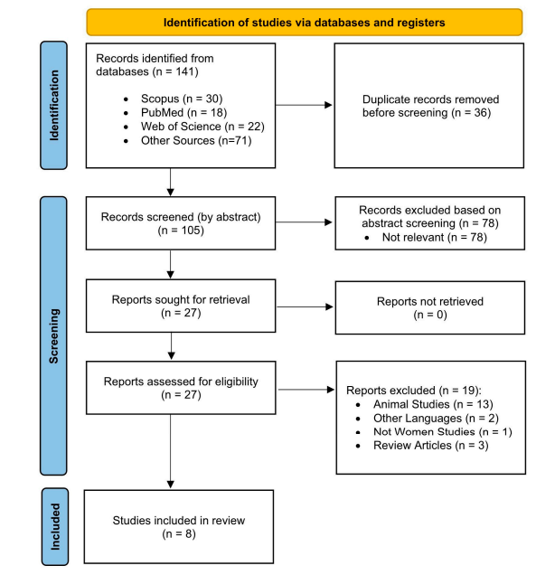 该综述采用Joanna Briggs Institute方法学及PRISMA-ScR报告规范,2025年3月和6月在Scopus、Web of Science、PubMed及其他数据库检索文献。纳入标准为:研究对象为患有生活方式相关疾病的女性,干预包括运动和纳米姜黄素联合或单独应用,报道健康相关临床指标,发表语言为英文。最终纳入8项研究,均来自伊朗,样本量12至53,干预持续6至16周。