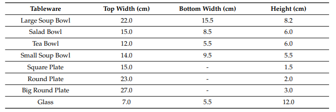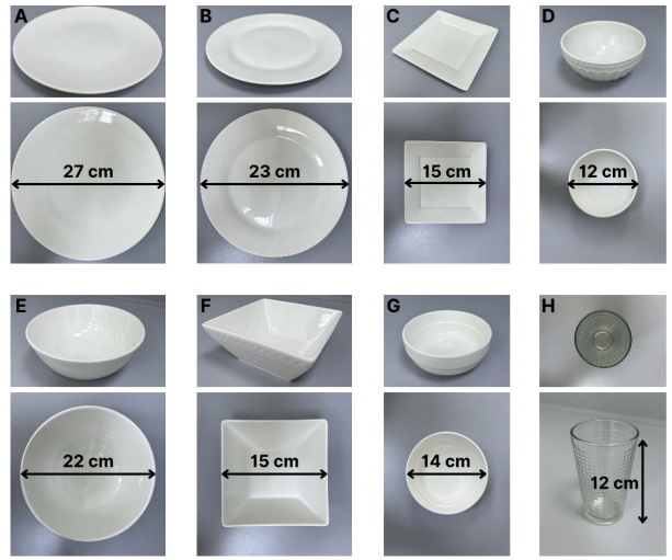 图:餐具示例(A)直径27厘米的圆形盘子;(B)直径23厘米的圆形盘子;(C)15 × 15厘米的方形盘子;(D)茶碗;(E)大汤碗;(F)沙拉碗;(G)小汤碗;(H)250毫升玻璃杯。