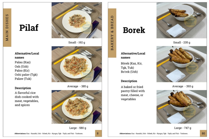 本数字视觉食品图谱基于两个大型数据集:中亚食品数据集(CAFD)与中亚食品场景数据集(CAFSD),共收录115种食品饮品,包括95种食物系列(分别呈现小、中、大三种份量)及20种饮料指南图。食品分为九大类:主菜、汤品、肉类菜肴、沙拉、小吃、配菜、面包与烘焙食品、甜点及饮料。每张图片均采用60度角拍摄,辅以统一光线、餐具、尺子及餐巾等参照物,保证视觉的一致性与份量感知的准确性。每个食品名称均包括英文及本地语言转写,增强文化与语言的适应性。该图谱适配网页与移动端,便于广泛应用。