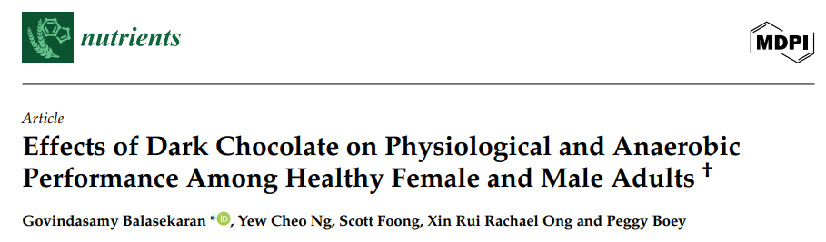 Balasekaran, G.; Ng, Y.C.; Foong, S.; Ong, X.R.R.; Boey, P. Effects of Dark Chocolate on Physiological and Anaerobic Performance Among Healthy Female and Male Adults. Nutrients 2025, 17, 3317. https://doi.org/10.3390/nu17213317