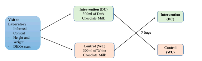 本研究纳入20名健康成年志愿者(10男10女),年龄21-35岁,无近期肌肉骨骼损伤,定期从事中高强度运动。采用随机单盲交叉设计,参与者分别摄入300毫升含51.48%可可粉的黑巧克力牛奶(DC组)或等热量的白巧克力调味牛奶(WC组,作为无黄烷醇对照组),两次试验间隔7天洗脱期。摄入后休息1.5小时,随后进行两组跑步式无氧冲刺测试(RAST),每组6次35米冲刺,间隔10秒,组间休息4分钟。测试中记录心率(HR)、感知用力评分(RPE)、冲刺时间及功率输出。 身体成分通过DEXA双能X射线吸收仪测定,心率监测采用Polar RS400传感器。运动前进行了标准化热身及RPE熟悉训练。所有实验均在相同环境和时间段进行,女性参与者试验安排于月经周期滤泡期以控制激素影响。