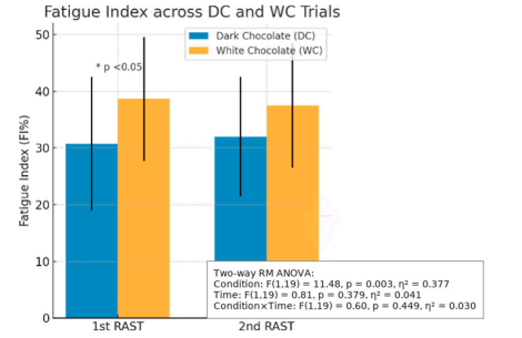 总之,黑巧克力摄入能显著提升无氧冲刺运动表现,降低疲劳指数,可能机制包括黄烷醇促进血管舒张、增强NO释放、加速氧气输送及抗氧化作用,蔗糖提供快速能量补充,二者协同作用优化能量代谢和运动耐力。 这些改善虽数值幅度较小,但在竞技运动中可成为胜负关键。黑巧克力作为易获得、成本低廉且安全的天然食品补剂,适合作为运动前饮品,辅助训练和竞赛表现。运动营养师可考虑根据个体差异和需求,将黑巧克力纳入个性化营养策略。