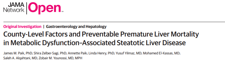 Paik JM, Zelber-Sagi S, Paik A, et al. County-Level Factors and Preventable Premature Liver Mortality in Metabolic Dysfunction-Associated Steatotic Liver Disease. JAMA Netw Open. 2025;8(10):e2538385. Published 2025 Oct 1. doi:10.1001/jamanetworkopen.2025.38385