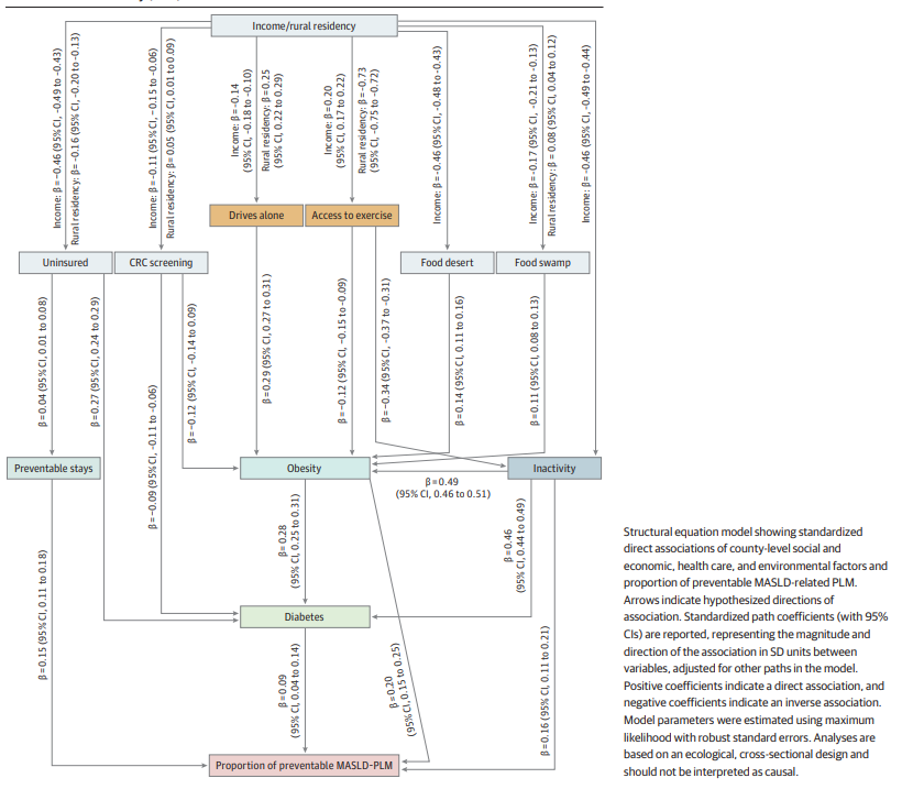 结果显示,2011至2020年间,美国平均每年MASLD-PLM约18345例,估计44.1%-58.0%可预防。80.7%的县域中,预防比例超过70%。农村县域预防比例较高,显著与身体不活动(标准化β=0.31)、肥胖(β=0.23)、可预防住院率(β=0.15)及糖尿病(β=0.09)相关。