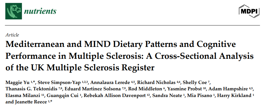 Yu, M.; Simpson-Yap, S.; Lerede, A.; Nicholas, R.; Coe, S.; Tektonidis, T.G.; Solsona, E.M.; Middleton, R.; Probst, Y.; Hampshire, A.; et al. Mediterranean and MIND Dietary Patterns and Cognitive Performance in Multiple Sclerosis: A Cross-Sectional Analysis of the UK Multiple Sclerosis Register. Nutrients 2025, 17, 3326. https://doi.org/10.3390/nu17213326