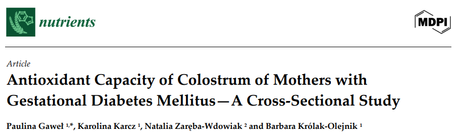 Gaweł, P.; Karcz, K.; Zaręba-Wdowiak, N.; Królak-Olejnik, B. Antioxidant Capacity of Colostrum of Mothers with Gestational Diabetes Mellitus—A Cross-Sectional Study. Nutrients 2025, 17, 3324. https://doi.org/10.3390/nu17213324