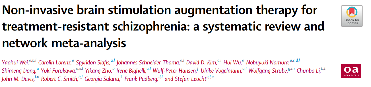 Wei, Yaohui et al.Non-invasive brain stimulation augmentation therapy for treatment-resistant schizophrenia: a systematic review and network meta-analysis.eClinicalMedicine, Volume 89, 103583