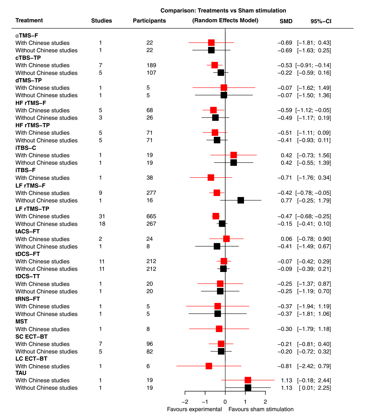 不同rTMS刺激靶点和参数间无显著差异。电休克治疗(SMD−0.20,CI−0.78至0.37)、tES(SMD−0.08,CI−0.38至0.22)及MST(SMD−0.30,CI−1.73至1.13)无明显优于假治疗的证据。间接证据提示常规治疗可能效果逊于假治疗(SMD 1.13,CI−0.13至2.38)。安全性方面,rTMS常见头痛及局部反应,整体不良事件报道不足,无法充分评价。 次要结局显示,rTMS对阳性症状、阴性症状和幻听有类似趋势,但排除中国研究后效果消失。少量证据表明tES可能改善抑郁症状。认知、功能及生活质量数据缺乏,难以得出结论。