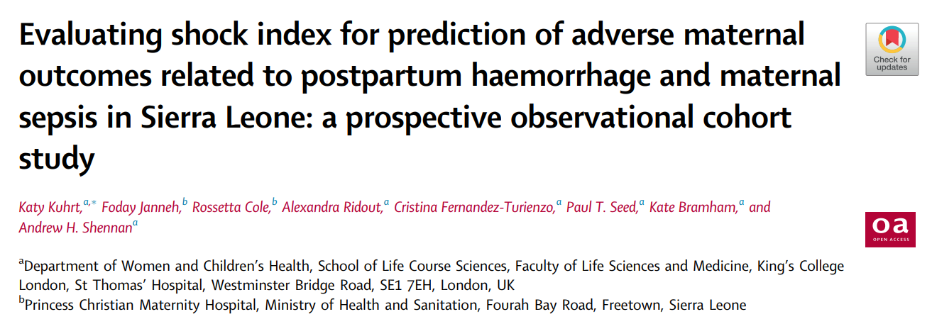 Kuhrt, Katy et al.Evaluating shock index for prediction of adverse maternal outcomes related to postpartum haemorrhage and maternal sepsis in Sierra Leone: a prospective observational cohort study.eClinicalMedicine, Volume 89, 103578