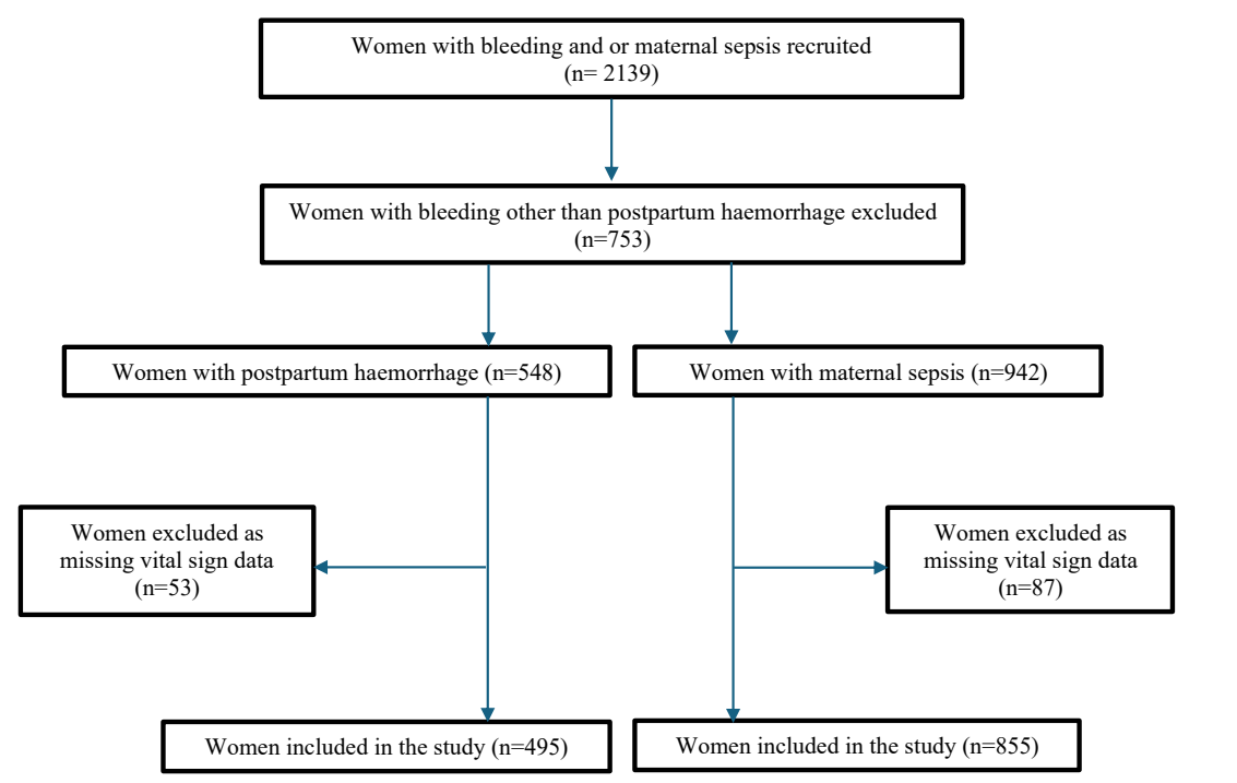 研究于2022年3月至2023年7月间,在塞拉利昂的三家产科医院(公主基督教产科医院、卡巴拉和莫扬巴政府医院)开展。纳入对象为住院期间诊断为产后出血或产妇败血症的495名和855名女性患者,部分患者同时合并两种诊断。产后出血定义为阴道分娩后估计失血量≥500 mL,剖宫产后≥1000 mL,或临床记录中明确诊断PPH。产妇败血症诊断依据体温≥37.5℃及临床表现。 生命体征采用Microlife CRADLE Vital Signs Alert(VSA)设备监测,该设备经验证适用于孕产妇,能测量血压和心率,并自动计算SI,同时设有基于SI阈值的交通灯预警系统(绿色、黄色、红色灯指示不同风险等级)。