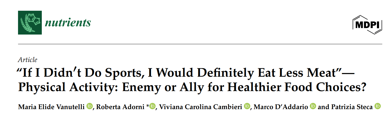 Vanutelli, M.E.; Adorni, R.; Cambieri, V.C.; D’Addario, M.; Steca, P. “If I Didn′t Do Sports, I Would Definitely Eat Less Meat”—Physical Activity: Enemy or Ally for Healthier Food Choices? Nutrients 2025, 17, 3362. https://doi.org/10.3390/nu17213362