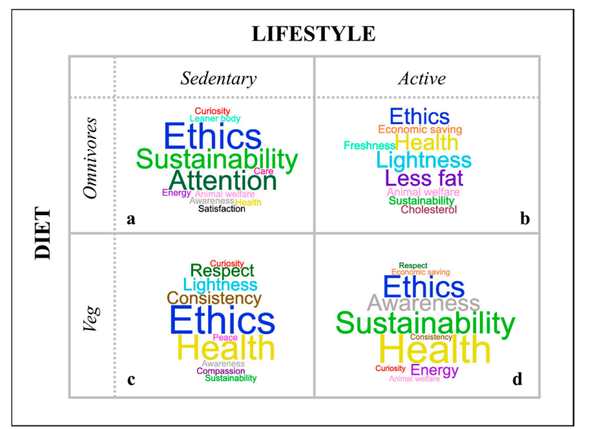 图:词云图总结了参与者对以下问题的回答:“设想开始完全植物性饮食,你认为有哪些积极方面?请尽可能多地写下你能想到的词语。” 上方展示的是久坐的杂食者参与者生成的词云(a部分),旁边是活跃的杂食者参与者生成的词云(b部分)。下方则是久坐的纯素食者参与者生成的词云(c部分)和活跃的纯素食者参与者生成的词云(d部分)。
