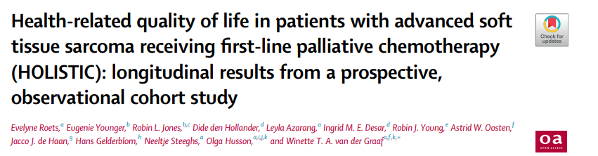 Roets, Evelyne et al.Health-related quality of life in patients with advanced soft tissue sarcoma receiving first-line palliative chemotherapy (HOLISTIC): longitudinal results from a prospective, observational cohort study.eClinicalMedicine, Volume 89, 103561