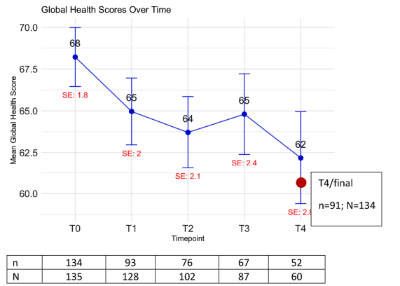 研究揭示了一个明确的趋势:患者的整体健康状况出现了具有统计学和临床意义的显著下降。从治疗前的平均分68.2分,到第4周期(或最终评估时)的60.7分,平均下降了11.3分。根据公认的标准,超过10分的变化即被视为“临床相关”,这意味着患者确实切身感受到了生活质量的恶化。更值得深思的是,这种生活质量的下降与肿瘤是否对化疗有效无关。无论是达到部分缓解或疾病稳定的患者,还是疾病进展的患者,其整体健康状况都出现了显著恶化。这强烈提示,化疗本身的毒性是导致生活质量下降的重要推手,而传统的影像学评估或许并不能完全代表患者所感受到的“临床获益”。