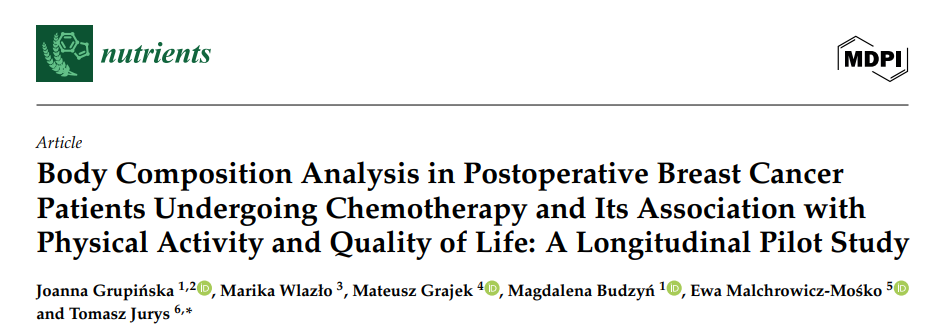 Grupińska, J.; Wlazło, M.; Grajek, M.; Budzyń, M.; Malchrowicz-Mośko, E.; Jurys, T. Body Composition Analysis in Postoperative Breast Cancer Patients Undergoing Chemotherapy and Its Association with Physical Activity and Quality of Life: A Longitudinal Pilot Study. Nutrients 2025, 17, 3352. https://doi.org/10.3390/nu17213352