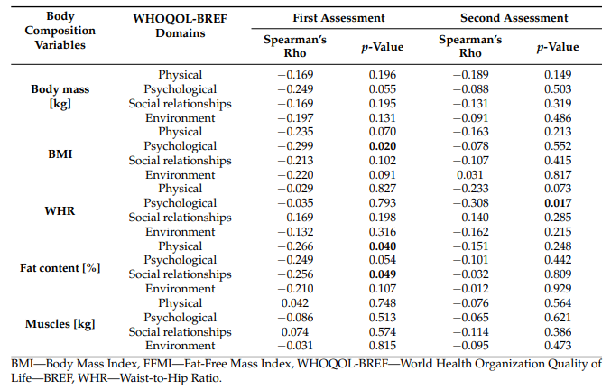 在生活质量的四个维度中,除环境领域有显著提升外,其余领域(身体、心理、社会关系)均未出现明显变化。环境评分的提高可能反映出患者对医疗资源、居住条件与社会支持的满意度上升。然而,研究也发现,脂肪比例与身体、社会关系领域的生活质量呈负相关,BMI与心理健康评分亦呈负相关,腰臀比更是在第二次评估中显著关联于心理健康的下降。这些数据揭示:脂肪的分布与数量,可能比肌肉量更直接地影响患者的心理与社交体验。