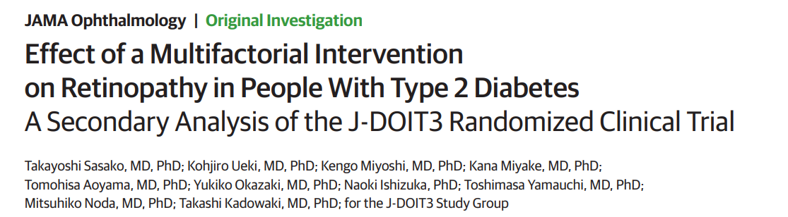 Sasako T, Ueki K, Miyoshi K, et al. Effect of a Multifactorial Intervention on Retinopathy in People With Type 2 Diabetes: A Secondary Analysis of the J-DOIT3 Randomized Clinical Trial. JAMA Ophthalmol. Published online October 23, 2025. doi:10.1001/jamaophthalmol.2025.3819