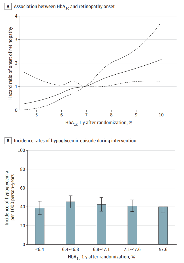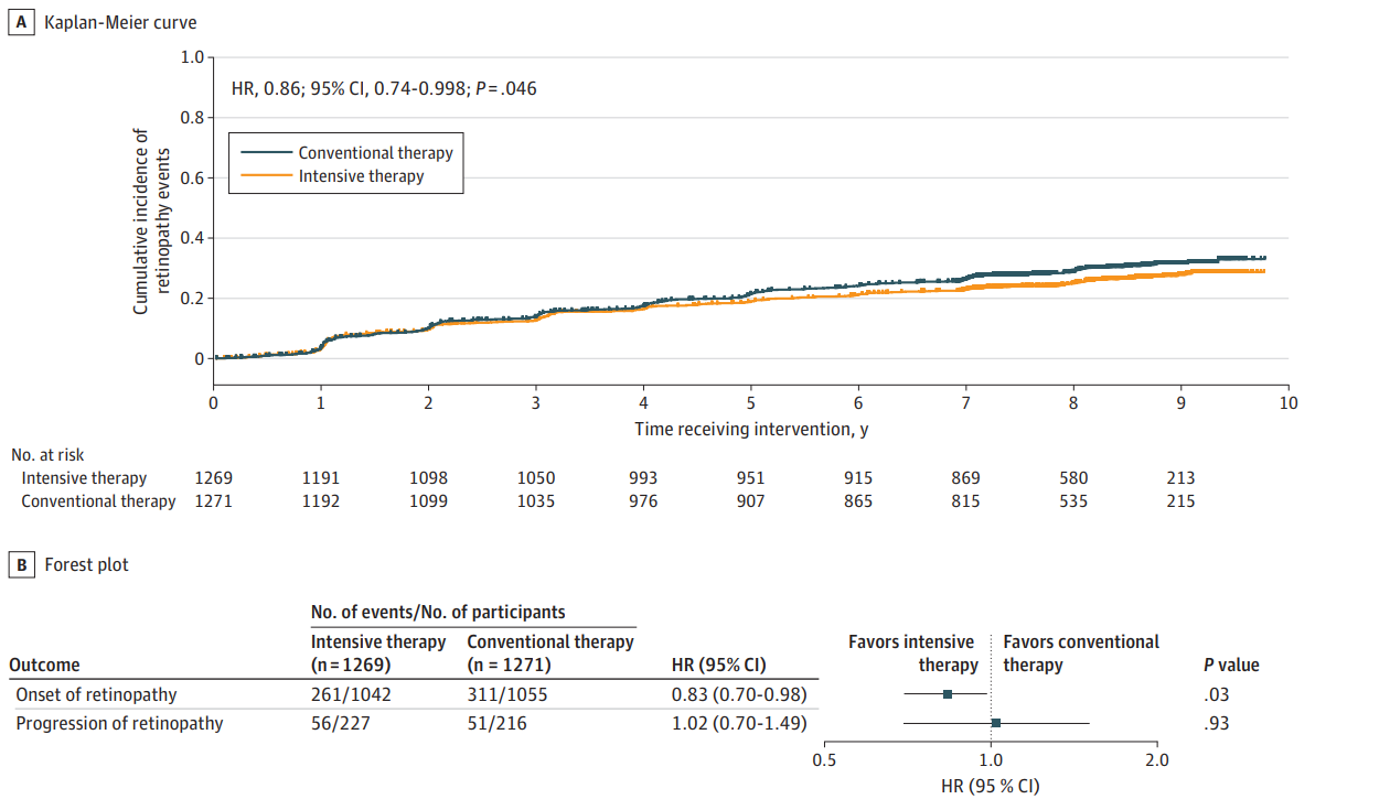 结果显示,共纳入2540名患者(5080只眼),平均年龄59岁,女性占38%。强化治疗组的HbA1c中位数为6.8%,常规治疗组为7.2%;胰岛素使用率均低于15%。经过8.5年中位随访,强化治疗组在视网膜病变发生风险方面显著降低,危险比(HR)为0.83(95%CI 0.70-0.98,P=0.03),但对视网膜病变进展无显著影响(HR 1.02,95%CI 0.70-1.49,P=0.93)。 多变量Cox回归分析显示,1年时的HbA1c水平与视网膜病变发生风险呈线性正相关(HR 1.31,95%CI 1.13-1.51,P<0.001),未发现明确的安全阈值。