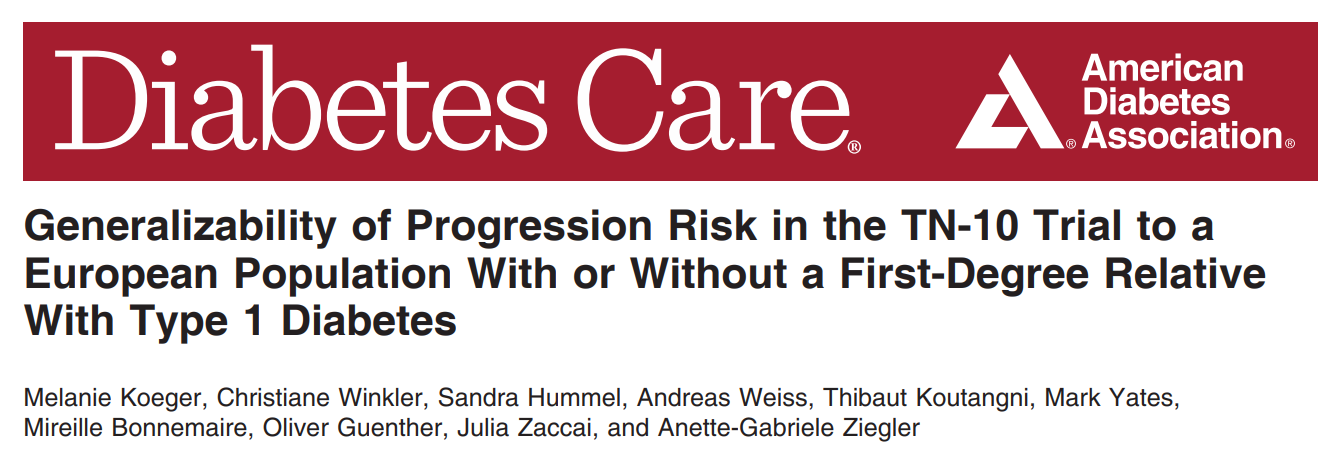Melanie Koeger, Christiane Winkler, Sandra Hummel, Andreas Weiss, Thibaut Koutangni, Mark Yates, Mireille Bonnemaire, Oliver Guenther, Julia Zaccai, Anette-Gabriele Ziegler; Generalizability of Progression Risk in the TN-10 Trial to a European Population With or Without a First-Degree Relative With Type 1 Diabetes. Diabetes Care 2025; dc251021.