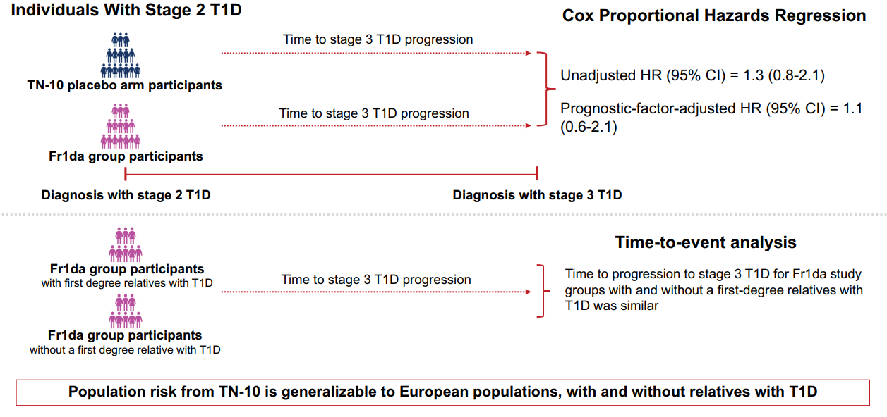 为了回答这个问题,研究人员进行了一项巧妙的回顾性研究。他们将TN-10试验中接受安慰剂治疗的32名参与者,与德国Fr1da筛查项目中的152名2期糖尿病患者进行了对比。