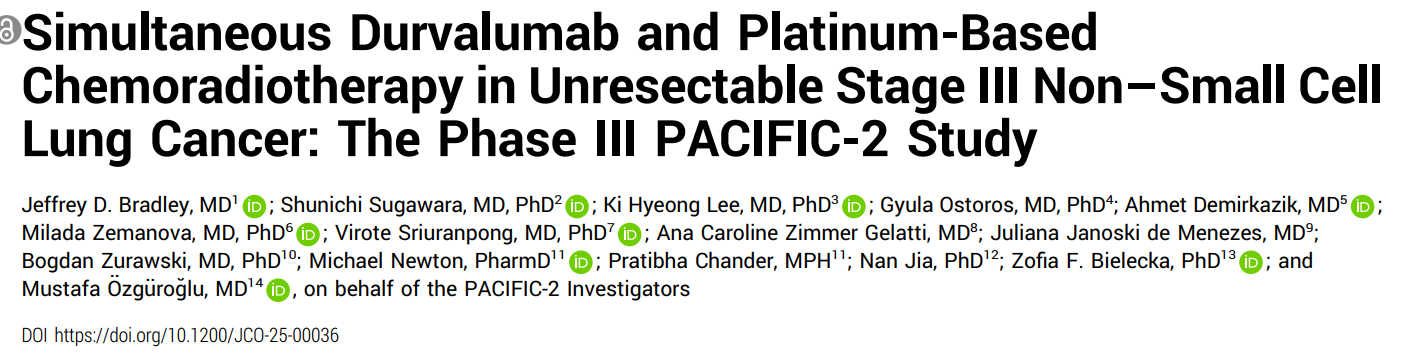 Jeffrey D. Bradley et al. Simultaneous Durvalumab and Platinum-Based Chemoradiotherapy in Unresectable Stage III Non–Small Cell Lung Cancer: The Phase III PACIFIC-2 Study. J Clin Oncol 0, JCO-25-00036