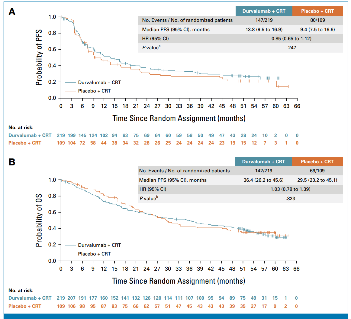 试验组(219例):从放化疗第1天起,同步接受度伐利尤单抗 + 标准化疗放疗,放化疗结束后继续使用度伐利尤单抗巩固治疗;