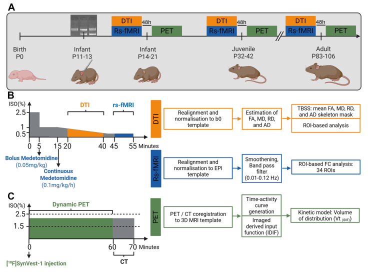 研究团队选取了37只携带KCNQ2 p.(Thr274Met)点突变的基因敲入(KI)小鼠与31只野生型(WT)对照,在三个发育阶段进行纵向成像:婴儿期(P14–P21)、青少年期(P32–P42)和成年期(P83–P106)。通过静息态功能磁共振成像(rs-fMRI)评估脑功能连接(FC)。SynVesT-1正电子发射断层扫描(PET)测量突触密度。扩散张量成像(DTI)分析白质与灰质微结构。