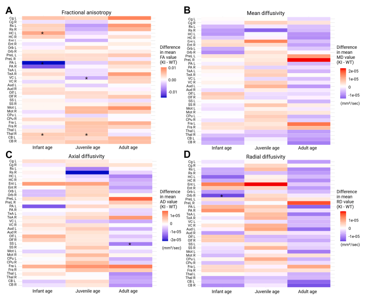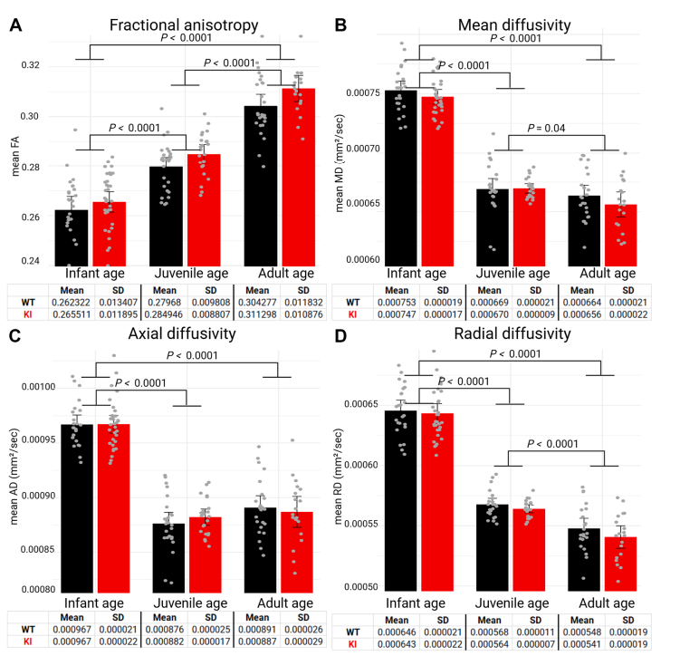 图:不同基因型和神经发育阶段全脑白质扩散指标的发育变化
