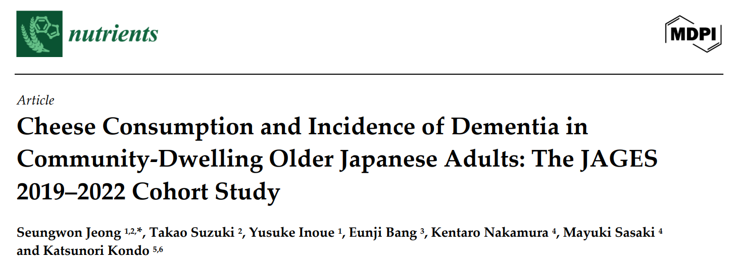 Jeong, S.; Suzuki, T.; Inoue, Y.; Bang, E.; Nakamura, K.; Sasaki, M.; Kondo, K. Cheese Consumption and Incidence of Dementia in Community-Dwelling Older Japanese Adults: The JAGES 2019–2022 Cohort Study. Nutrients 2025, 17, 3363. https://doi.org/10.3390/nu17213363