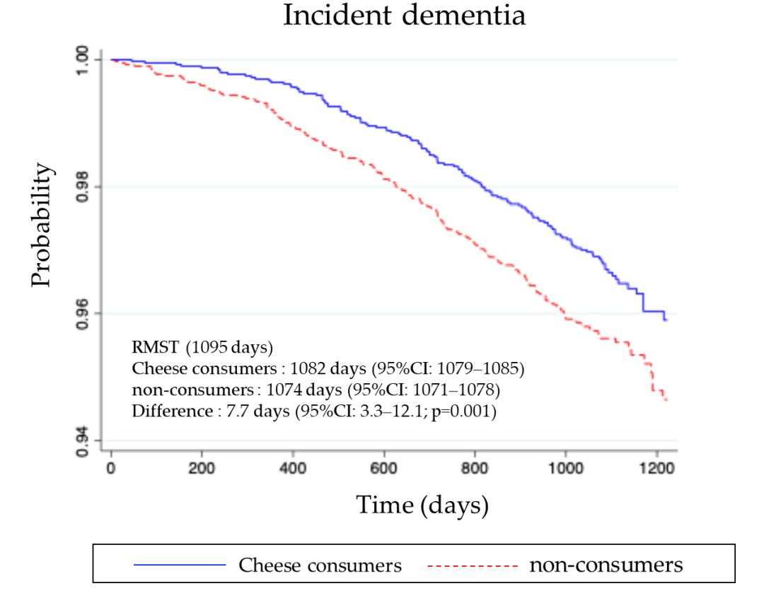 结果显示,共纳入7914名参与者(奶酪消费者3957,非消费者3957),基线特征平衡良好。三年内,消费者组中134人(3.4%)发生痴呆,非消费者组中为176人(4.5%),绝对风险差为1.06个百分点。奶酪消费与痴呆风险显著负相关(HR=0.76,95% CI 0.60–0.95,p=0.015)。调整肉类、鱼类及蔬果摄入频次后,关联略减弱但仍显著(HR=0.79,95% CI 0.63–0.99,p=0.04)。限制性平均存活时间分析显示,奶酪消费者的无痴呆存活时间平均延长约7.7天。