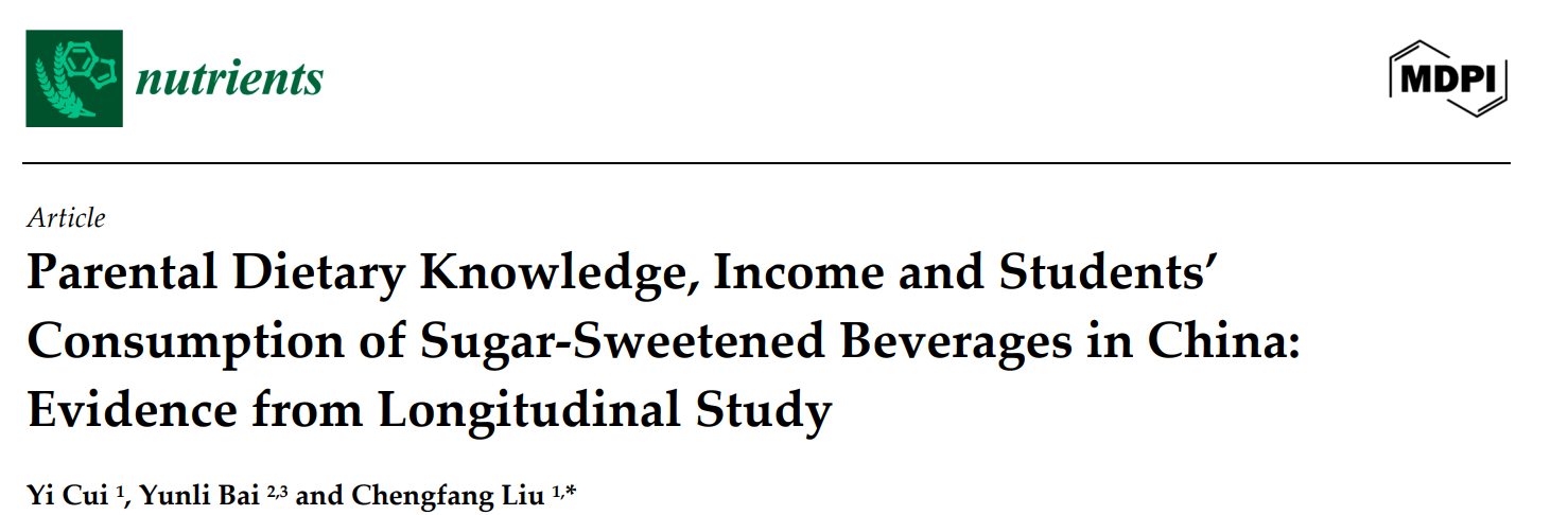 Cui, Y.; Bai, Y.; Liu, C. Parental Dietary Knowledge, Income and Students’ Consumption of Sugar-Sweetened Beverages in China: Evidence from Longitudinal Study. Nutrients 2025, 17, 3356. https://doi.org/10.3390/nu17213356