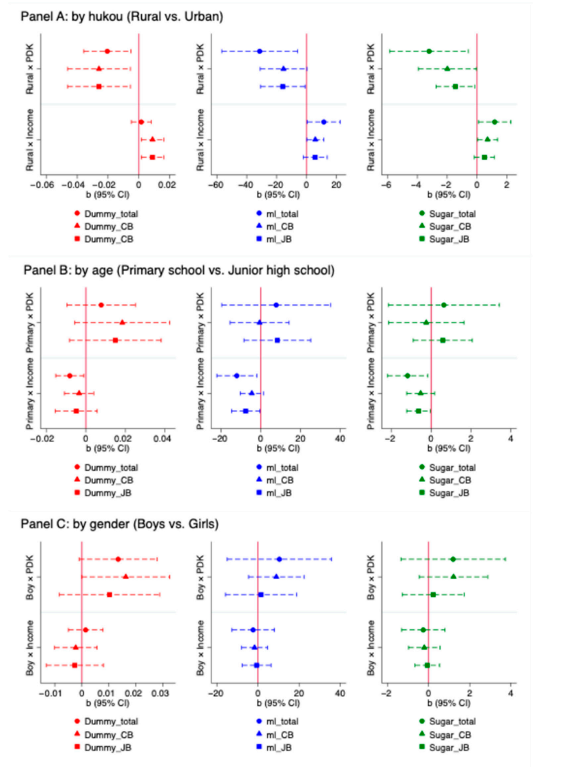 此外,父母营养知识与收入对含糖饮料消费的负向影响更显著,提示农村家庭的营养知识提升有更大潜力降低学生含糖饮料摄入。随着学生年龄增长,家庭收入对含糖饮料消费的正向影响增强,反映初中生饮食自主权提升。 - 性别分组未见显著差异。