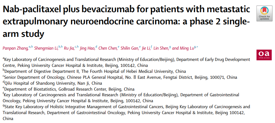 Zhang, Panpan et al.Nab-paclitaxel plus bevacizumab for patients with metastatic extrapulmonary neuroendocrine carcinoma: a phase 2 single-arm study.eClinicalMedicine, Volume 90, 103598
