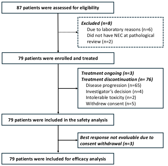 该项研究于2021年1月至2024年3月期间开展,共纳入79名 既往接受过至少一线系统治疗(全部接受过铂类化疗)后进展的晚期EP-NEC患者。患者每两周接受一次纳武紫杉醇(150 mg/m²)联合贝伐珠单抗(5 mg/kg)静脉输注,直至疾病进展或出现不可耐受的毒性。