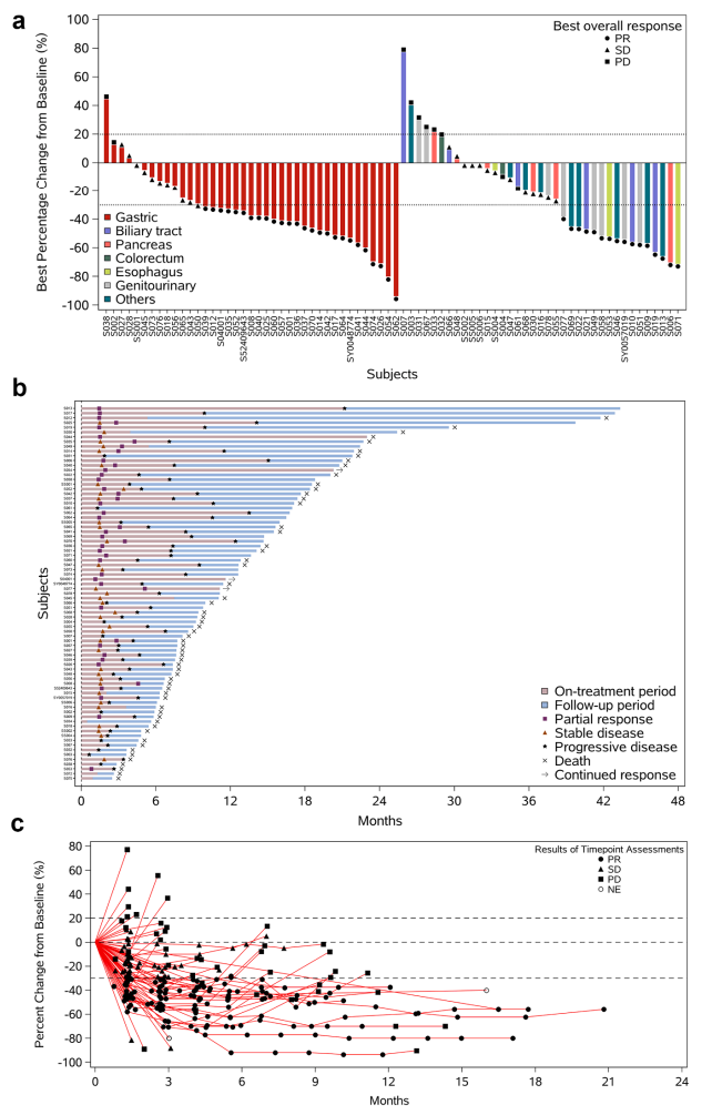 图:根据 RECIST v1.1 标准评估的客观缓解情况。a. 有效性可评估患者中,按原发部位划分的最佳肿瘤缓解瀑布图。“其他” 类别包括未知部位(n=5)、十二指肠(n=2)、胸腺(n=2)和臀部(n=1)。b. 治疗暴露时间与缓解持续时间;c. 肿瘤大小随时间的总体变化。